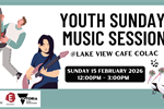 2026 Youth Sunday Music Session 15 Feb 2026 Join us on Sunday, 15 February between 12pm-3pm at Lake View Cafe Colac for a great afternoon of live music from our talented youth. Lake View Cafe Colac, 1 Fyans Street, Colac 3250 Tagged as: , Music & Theatre, Performing & Visual Arts, Youth Event