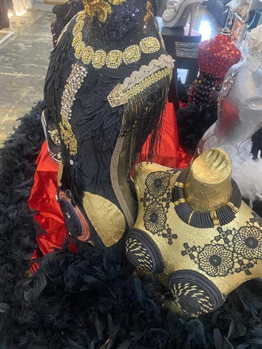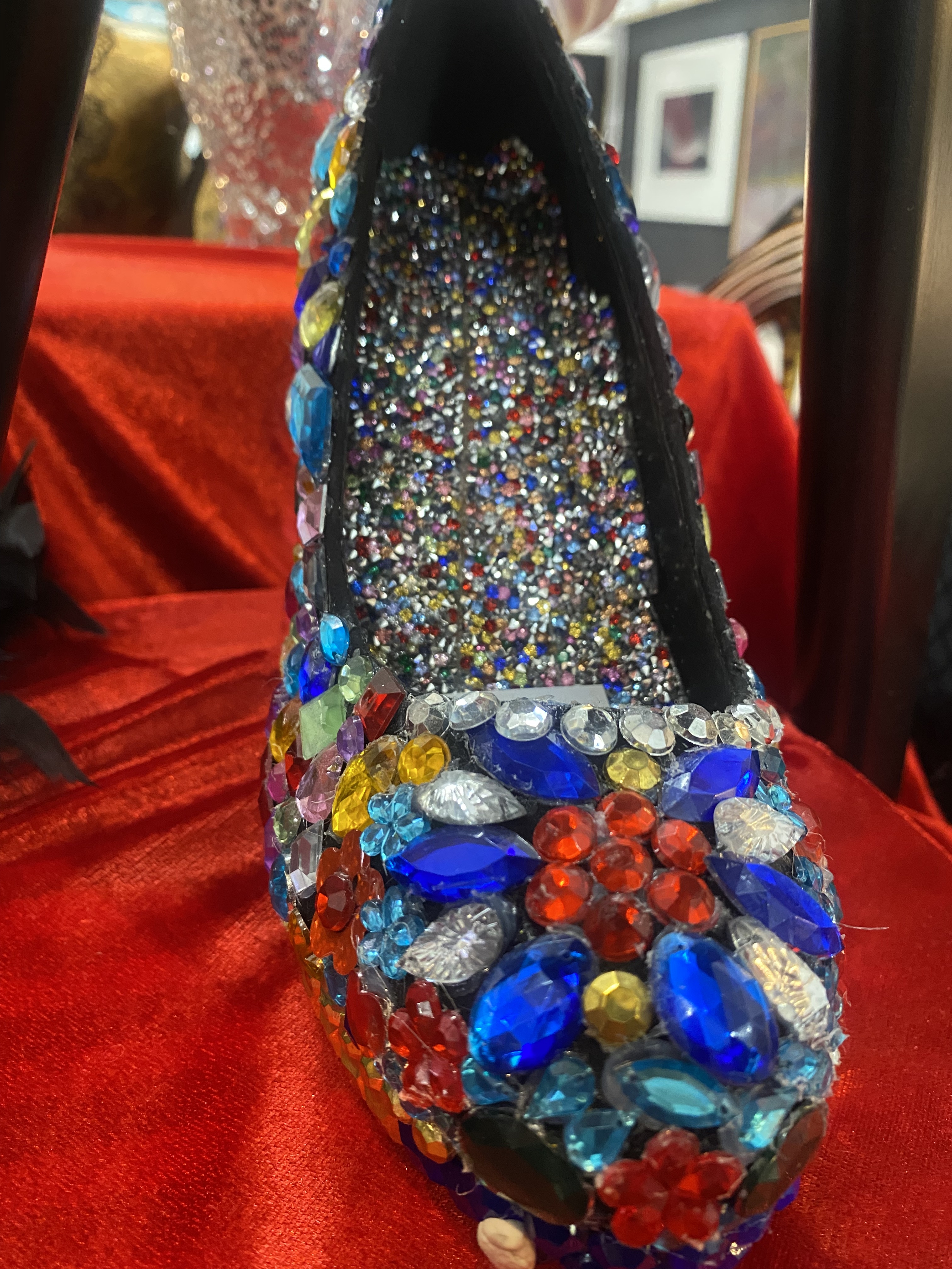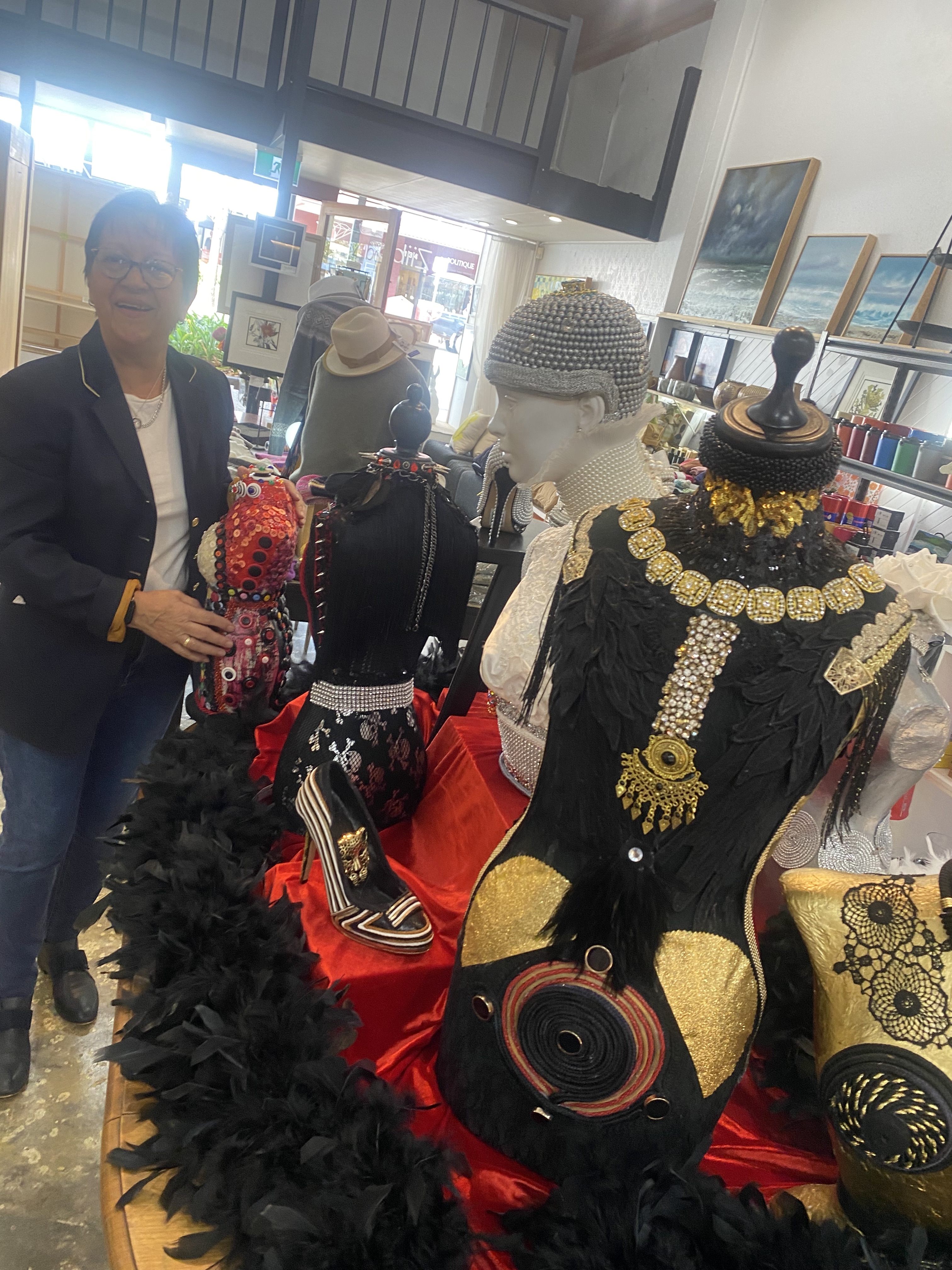Vanessa transforms the familiar into the extraordinary, reimagining the human form through intricately adorned mannequins and sculptural high-heeled shoes. Each piece is meticulously embellished with layers of beads, reclaimed jewellery, and cascading tassels, creating works that shimmer with texture, movement, and narrative.